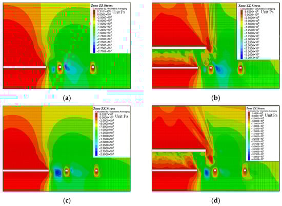 Cloud maps for the vertical stress of the surrounding rock of the CTR under different working conditions are shown in Figure 7. Before the coal seam 5# was mined, the mining influence of coal seam 1# has led to an increase in stress concentration on both sides of the CTR. The maximum stress concentration coefficients of the working conditions 1-1, 1-2, and 1-3 reached 2.70, 2.49, and 2.44, respectively, which were 1.78 to 1.98 times that before the mining of coal seam 1#. Hence, the concentrated stress on both sides of the CTR is asymmetrically distributed, and the mining influence of the coal seam 1# leads to a sudden increase in stress concentration on both sides of the CTR.