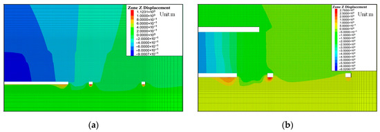 Cloud maps of vertical displacement of surrounding rock in the CTR under different working conditions: (a) 1-1; (b) 2-1; (c) 1-2; (d) 2-2; (e) 1-3; (f) 2-3.