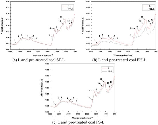 The lignite samples were processed using the potassium bromide (KBr) pellet method, and the changes in functional group content before and after microbial pre-treatment were compared by analyzing the main characteristic peaks, as shown in Figure 2. In the lignite samples pre-treated with different microorganisms, significant changes were observed in the hydroxyl (OH) groups of phenols, alcohols, and carboxylic acids, the C=C skeletal vibration of the benzene ring, the C-H stretching vibration of aldehydes, and the out-of-plane bending vibrations of C-H bonds in aromatics [17,18]. The PS-L group showed a more significant decrease compared to the ST-L group in these functional groups. Additionally, the asymmetric stretching vibration of CH3 in naphthenic or aliphatic structures, the methylene CH2 stretching vibration, and the symmetric stretching vibration of methylene CH2 were clearly visible. Among the three microbial treatments, the PH-L group exhibited stronger functional group vibrations than the other two groups. White rot fungi demonstrated a stronger degradation effect on the side chains, branched chains, and benzene ring skeletons compared to Pseudomonas and Streptomyces viridigriseus, leading to butyric acid as the primary degradation product, although other degradation products showed variability.