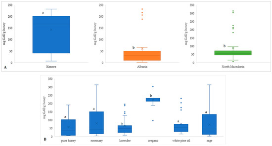 Total phenolic content (TPC mg GAE/g honey) per countries of purchased honey (A) and differences based on the added aromatic plant (B), regardless of the added concentration. Different letters for the same parameter indicate a statistically significant difference (p < 0.05).