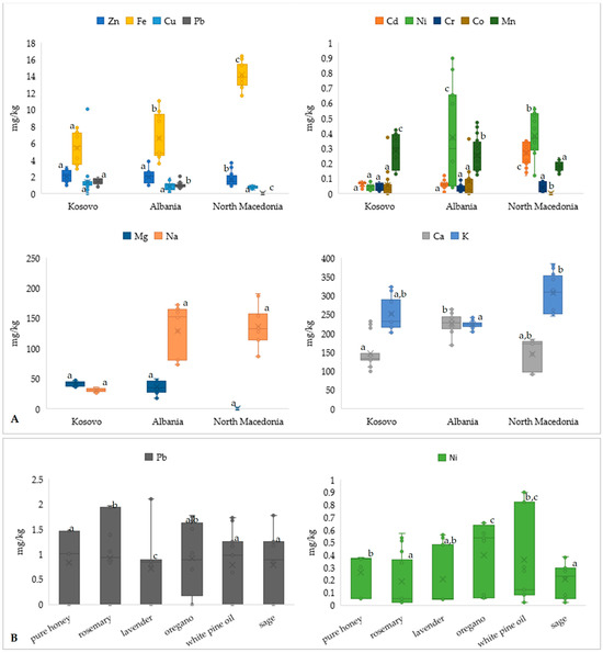 Concentration of heavy metals in samples of honey from different regions (A), with isolated examples of changes in heavy metal concentrations depending on the added aromatic plant, for Pb and Ni (B), regardless of the added concentration. Different letters for the same parameter indicate a statistically significant difference (p < 0.05).