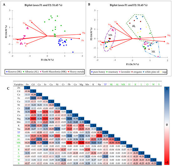 Biplot of the principal component analysis (PCA) for total phenols (TPs) and heavy metal values (Zn, Cd, Fe, Cu, Ni, Cr, Pb, Co, Mg, Mn, K, and Na) in three regions (Kosovo—XK, Albania (AL), and North Macedonia (MK) with added aromatic plants (R—rosemary, L—lavender, O—oregano, W—white pine oil, and S—sage), regardless of the added concentration. PCA is presented with countries as qualitative variables (A) and aromatic plants as qualitative variables (B). Pearson’s correlation matrix interrelationships in the observed set of variables (C) where the correlation indicates a strong relationship (value 1, blue in the legend) and an inversely proportional relationship that can go to —1, red in the legend.