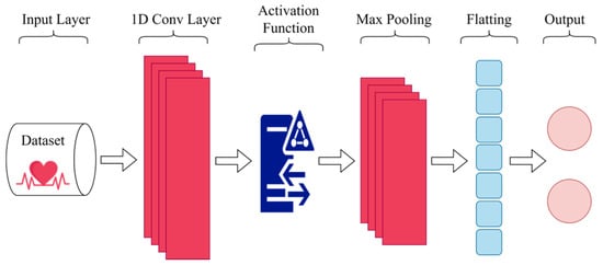 The 1D CNNs operate similarly to 2D-CNNs except they are tailored to handle one-dimensional data, employing 1D convolutional filters instead of 2D filters. One-dimensional CNNs have fewer parameters, making them computationally efficient compared to 2D-CNNs []. They excel in capturing temporal relationships in signal data and extracting local characteristics that are resilient to minor temporal shifts. Thus, 1D CNNs are ideal for analyzing time series data with temporal dependencies. Overall, these characteristics of CNNs make them an effective analytical technique for analyzing and classifying various types of signal data, including the time series data like ECG signals. Formula (3), used for a 1D CNN, can be expressed as []
