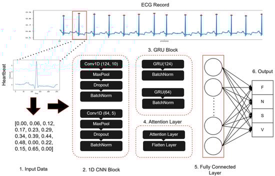 The integration of the proposed model architecture involves combining the CNN and GRU layers cohesively with interconnections, incorporating an attention mechanism to enhance performance. CNN’s output feeds seamlessly into the GRU in order to ensure a continuous flow of information from spatial processing to temporal analysis. This integration allows end-to-end training to facilitate the suggested model to learn intricate representations directly from raw ECG signals [].