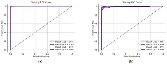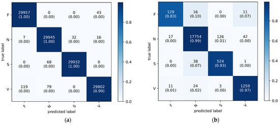 It is noteworthy that data resampling was carried out exclusively on the training dataset to address class imbalance. Specifically, the majority class ‘N’ was under-sampled to 30,000 samples, while the minority classes ‘S’, ‘V’, and ‘F’ were each over-sampled to 30,000 samples. The testing dataset remained unchanged to accurately assess the performance of the machine learning model on new data without any data leakage. This approach ensures that the training dataset is balanced, preserving data integrity and maintaining an unbiased testing dataset representative of real-world conditions.