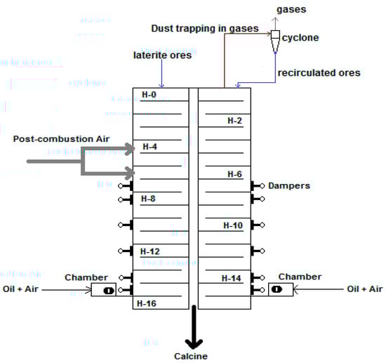 The experiments were carried out in the conventional multiple hearth furnace (see Figure 2) in the pilot plant of the CEDINIQ. The reducing atmosphere was generated from the combustion of fuel oil in the combustion chambers, enriched with the use of the mixture of bituminous coal at 2.0 wt. % and fuel oil at 1.25 wt. % (BC2-FO1.25) as a reducing additive, with characteristics similar to those reported by Angulo et al. [9,32].