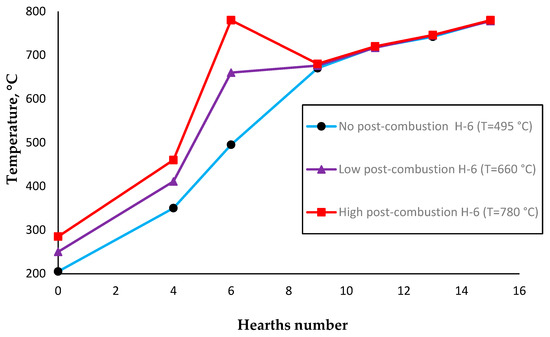 In this study, three levels of post-combustion air feed were evaluated in furnace six (H-6) for five days of operation each; their control was ensured by measuring the average temperature of H-6 at 495 °C with no post-combustion, 660 °C with low post-combustion, and 780 °C with high post-combustion. Figure 3 shows the temperature profile used in each furnace zone for each of the experiments ± 5 °C. Additionally, Ni extraction contents were determined using Equation (1), with an uncertainty of ±1.5%, to identify whether significant changes occurred during the evaluation of the different temperature levels in H-6.
