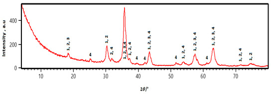 X-ray diffraction pattern of the reduced-leached mineral. 1—Magnetite, syn: Fe3O4; 2—Maghemite, syn: Fe2O3; 3—Magnesiochromite, ferroan: [(Mg, Fe)(Cr, Al)2O4]; 4—Fayalite: Mg26Fe1,74(SiO4).