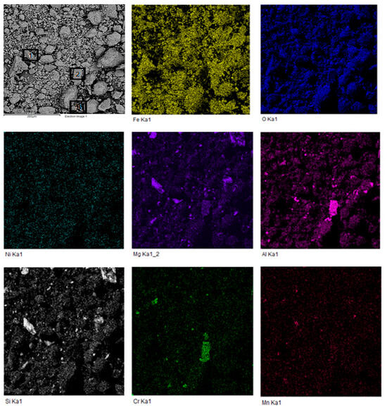 The XRD results (Figure 4) and the distribution of elements in the reduced mineral (Figure 5) also allow us to identify the presence of the mineralogical phases Maghemite, Fayalite, and Ferroan Magnesiochromite; it was confirmed that the temperatures exceeding 700 °C in the lower hearths likely explain the persistence of unreduced Ni phases.