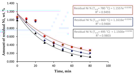 Figure 6 and Appendix A present the kinetic behavior of residual Ni % during the reduction process at different temperatures of the H-6 under study. The kinetics (k) of residual Ni% were characterized by a first-order reaction distribution with coefficients of determination greater than 0.9484, similar to that reported by Castellanos [40] during the evaluation of pyrite as a reducing additive. It is important to note that the significant changes shown by k as the post-combustion air-supply conditions varied are striking, as it regularly showed a behavior inversely proportional to the increase in temperature in H-6. This behavior can be justified by the dilution of the reducing gases generated by the air supply to the furnace in the heating zone. Furthermore, is observed that when the post-combustion air flow in H-6 decreases (see Figure 6 for the transformations starting at 20 min), the amount of residual Ni decreases considerably; this behavior can be explained by the early execution of the dehydroxylation processes of gohetite and lizardite, as suggested by various studies [28,41,42]. Regarding the shape of the curves, it suggests that the mechanism that best describes the roasting/reduction process is a combination of the diffusion model through the ash layer (DAL) and the growth of the nucleus (GN), being the controlling stage of the DAL, similar to that reported by Angulo et al. [32], regardless of the operating condition under analysis (see Appendix B).