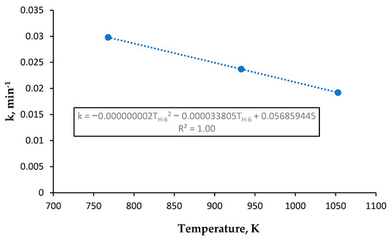 Figure 7 models the relationship between k and the increase in temperature of H-6 of the furnace. The model that best describes the relationship is a decreasing second-order polynomial with a coefficient of determination and residual error of 1.00 and 0.00, respectively, indicating that the increase in hearth temperature exerts a negative influence on the roasting/reduction process by decreasing k by 7.0938% for every 57 °C increase in the hearth temperature, with a confidence level of 95%.