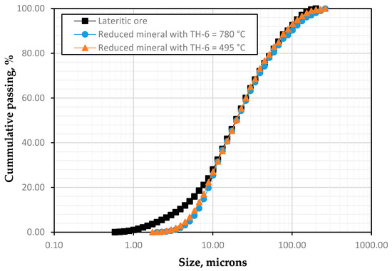 The effect of H-6 post-combustion air feed on the granulometry of the reduced mineral is shown in Figure 8 and Figure 9. Regardless of the operating conditions used in the reactor, it is observed that the lateritic ore after the roasting/reduction process experiences a growth in the average diameter of its particles, where the main changes are shown in the particle sizes greater and less than 67 and 10 μm, respectively, with an increase in the maximum particle size of the reduced mineral (262,376 μm) of 23.77% compared to that of the lateritic ore (200 μm); see Figure 8.