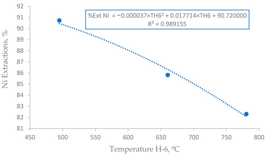 Figure 10 shows the behavior of the average Ni extractions as a function of H-6 temperature. It was observed that the extractions range from 82 to 91%, where the shape of the curve confirms the negative effect generated by the supply of post-combustion air on the extractions of the process, causing a decrease of 1.68% for every 57 °C increase in the hearth in a temperature range of 495–780 °C. Furthermore, the best-fitting mathematical model is a decreasing quadratic polynomial, with a coefficient of determination greater than 98% and an absolute error of 0.33%. It is important to note that these results coincide with those obtained at pilot scale when analyzing the effect of post-combustion in H-6 with the use of the reducing additive FO2.5 [10].