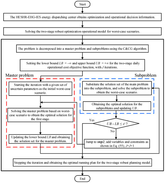 In consideration of uncertainty and hydrogen energy heat recovery, a two-stage robust model, namely HESHR-EHG-IES, is constructed in this study. The C&CG algorithm is employed for solving the model [26]. Similar to the Benders decomposition algorithm, the C&CG algorithm decomposes a complex two-stage problem into an outer master problem and inner subproblems, which are iteratively solved to obtain the optimal solution of the original problem. The main difference lies in the fact that the C&CG algorithm gradually introduces constraints and variables related to the subproblems into the computation process of the master problem. As a result, it can obtain a more compact lower bound of the original objective function value, effectively reducing the number of iterations.