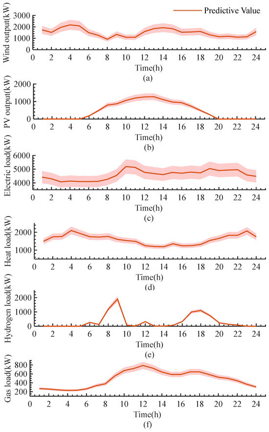 where represent the predicted power values of photovoltaic output, wind power output, electricity load, gas load, heat load, and hydrogen load, respectively, at time period .