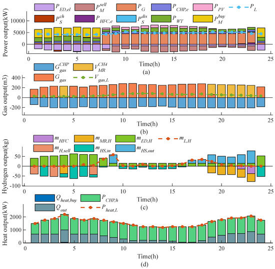 In Figure 6d, during a 4 h period, the heat load reaches its peak and is jointly supported by the HESHR, CHP, and heat purchased from the heating network. During the time periods of 1–3 h and 5–24 h, the heat load demand is solely met by the HESHR and CHP. Throughout the 1–24 h period, the output power of the CHP unit remains relatively stable over one scheduling period, while the heat power output of the hydrogen energy system fluctuates greatly, thereby reducing the pressure on the heat energy output of the CHP unit.