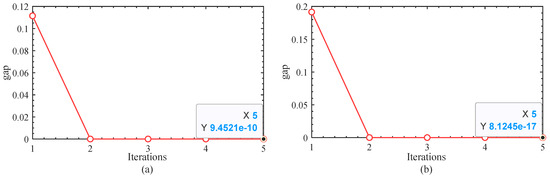 To validate the effectiveness of the proposed HESHR-EHG-IES model, which considers uncertainties on both the source and load sides, an analysis will be conducted on the convergence of the solution algorithm and the robustness of the obtained solutions. The uncertain parameters are set to 6 and 12, the robustness level to 0.1, and the convergence gap to 1 × 10−6. The convergence effect of the HESHR-EHG-IES robust operating model is shown in Figure 7.