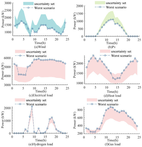 Worst-case scenarios on both the supply and demand sides: (a) wind, (b) PV, (c) electrical load, (d) heat load, (e) hydrogen load, (f) gas load.