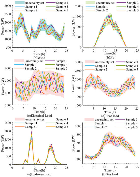 Considering the errors between predicted and actual values of wind power output, photovoltaic output, electricity load, gas load, heat load, and hydrogen load, a box uncertainty set is constructed, as shown in Equation (46).