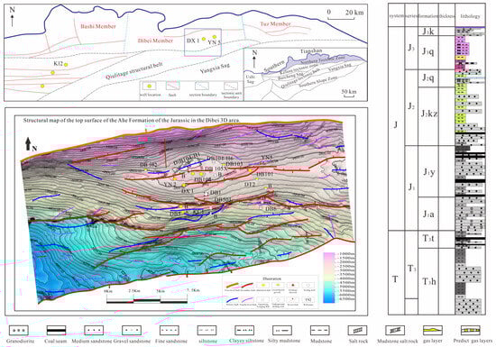 The tectonic location of the Dibei area and the top surface structure of the Ahe Formation.