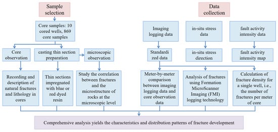 We retrieved core samples from 10 cored wells in the Kuqa Depression. To better document lithology, sedimentary structures, and natural fractures, we collected 360° scanned core surface photographs. A total of 869 core samples were observed and recorded; detailed records and descriptions of natural fractures and lithology of the cores were then made. Thin sections (30-micrometers-thick) impregnated with blue- or red-dyed resin were utilized to detect pore spaces. Additionally, imaging logging data from 8 wells were collected, and a total of 549 fractures of various types were identified and screened. In addition, we have also collected structural data, such as in situ stress data and fault activity intensity data in the area, to draw relevant maps. The detailed process is shown in Figure 2.
