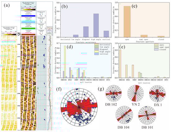 (a) Imaging logging image of Well DB104 at a depth of 4765–4770 m; (b) Statistical chart of fracture occurrences in the Dibei area; (c) Statistical chart of fracture apertures in the Dibei area; (d) Statistical chart of fracture occurrences at different well locations; (e) Statistical chart of fracture apertures at different well locations; (f) Statistics of the overall fracture strike (red) and dip (blue) in the Dibei area; (g) Statistics of the fracture strike (red) and dip (blue) of a single well [43].