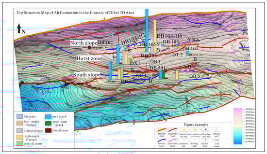 The fractures in the study area are mainly high-angle fractures and open fractures; among them, high-angle fractures account for approximately 54.6%, with open fractures comprising around 89.6% (Figure 3b,c). Their planar distribution is significantly controlled by the structural position, following the development pattern of “the high part of the fault-block zone > the southern slope > the low part of the fault-block zone” (Figure 4). The high part of the fault-block zone, as the area where tectonic stress is concentrated and released, has the highest degree of fracture development. For example (Figure 3d,e, Table 2), taking Well DB 104 as an example, the number of open fractures reaches 60, with a density of 0.809 fractures/m and a high-angle fracture density of 0.547 fractures/m. The fractures in Well DB 104 are mainly high-angle open fractures, indicating good fracture development. In Well DX1, the density of open fractures is 0.376 fractures/m, with well-developed inclined fractures and high-angle open fractures, showing a relatively good development situation. The low part of the fault block zone has weak tectonic stress and poor fracture development. For example, Well Dibei 102 exhibits poor fracture development, with a low fracture density of 0.021 fractures/m, dominated by bedding and oblique fractures, all of which are closed. In Well DB101, the entire cored interval of the Ahe Formation contains one low-angle fracture and one oblique fracture, resulting in a fracture density of 0.004 fractures/m, indicating poor development. Well DT2, located in the low part of the horst zone, has a high-angle fracture density of 0.013 fractures/m, along with a small number of low-angle and oblique fractures, predominantly open ones. The fracture development degree in the southern slope is between that of the high and low parts of the fault block zone. In Well DB5, located in the high part of the southern slope, the fracture density is 0.372 fractures/m, with developed bedding fractures, vertical fractures, and high-angle open fractures, presenting a relatively good development situation. In Well DB501, located in the relatively high part of the southern slope, there are 113 open fractures with a density of 0.16 fractures/m, and inclined fractures, high-angle open fractures, and semi-open fractures coexist, also showing a relatively good development situation.