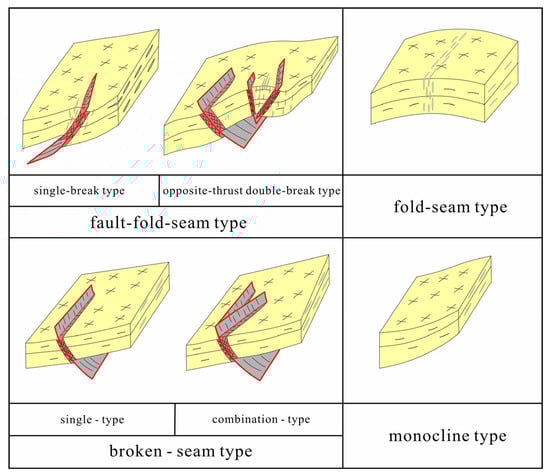 The monocline tectonic style occurs in areas that have not been significantly affected by tectonic activities, and no obvious fracture zone is formed. In this tectonic style, the strata are relatively stable, lacking sufficient tectonic stress to promote the formation of large-scale fractures. Therefore, the degree of fracture development is poor [47]. As shown for the monocline type in Figure 5, strata present a gently dipping monocline morphology. Sparse fractures are generated in the monocline strata due to regional tectonic stress or differential sedimentation. Tectonic deformation is dominated by simple tilting, with relatively low fracture development, which is controlled by the monocline stress field.