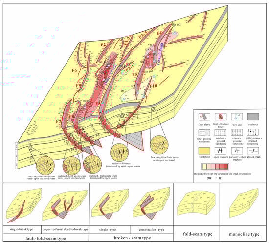 - In the fault–fold–fracture type, the activities of folds and reverse faults provide the driving force and space for fracture formation. The fault–fracture type is controlled by 2–3-grade faults, with more fractures in favorable rock layers. In the monocline type, due to the stable structure and weak stress, fracture development is scarce. Overall, in the study area, the fault–fold–fracture type has the most fractures, followed by the fault–fracture type, and the monocline type has the least.