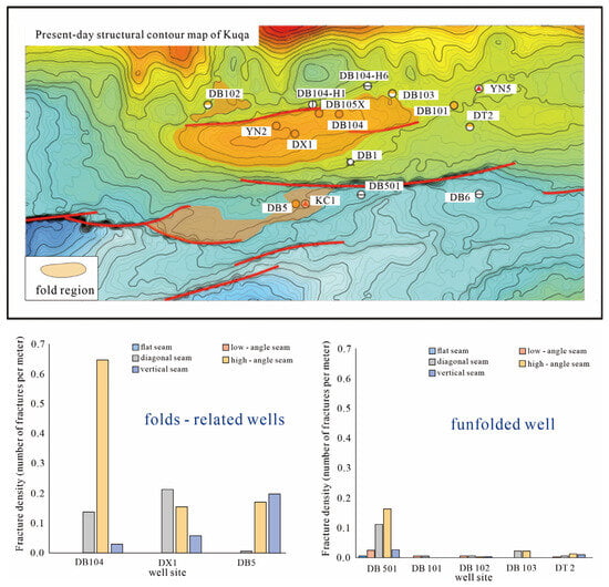 Folds play a crucial controlling role in the development of natural fractures in the tight reservoirs of the Ahe Formation in the Dibei area of the Tarim Basin [48]. Based on actual geological data, the strata rocks in the folded areas are subjected to intense compression and deformation, leading to stress concentration within the rocks and the development of high-angle open fractures (Figure 7). Taking Well DT 2 as an example, there is a significant difference in fracture development between its folded and non-folded parts. The rocks in the folded part undergo bending deformation under tectonic stress, and the weak planes within the rocks are stretched and ruptured, resulting in the formation of numerous high-angle open fractures. In contrast, in the non-folded part, the overall tectonic stress is relatively weak, the degree of rock deformation is low, and the fracture development is poor.