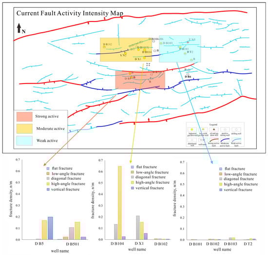 For example, during the activation of a strongly active fault, substantial displacement and friction occur. These processes cause the rocks surrounding the fault to fracture, giving rise to a multitude of fractures. These fractures are not only abundant in number but also possess relatively large apertures and favorable connectivity, thereby creating propitious conditions for the migration and accumulation of oil and gas. By integrating the current fault activity map with imaging logging data from diverse wells in the Dibei area, it becomes evident that the fracture density in the vicinity of strongly active faults is significantly higher than that near weakly active faults. For both strongly active and moderately active faults, a closer proximity to the fault corresponds to more favorable fracture development. This phenomenon can be attributed to the fact that rocks in the vicinity of the fault are subjected to more intense stress. In stress-concentrated zones, the internal granular structure of the rock is disrupted, leading to the formation of numerous fractures. Additionally, fault activity may trigger geological events, like earthquakes, which further contribute to rock fracturing, augmenting the number and scale of fracture [52]. For instance, when a fault experiences displacement, the surrounding rocks are subjected to additional impact forces. This disrupts the original intact rock structure, generating new fractures and facilitating the further propagation of existing fractures [53].