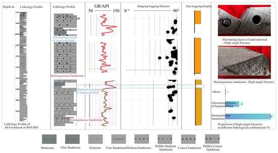 In sand–mud interbeds, the presence of mudstone mitigates fracture development. Mudstone, with its high plasticity, can undergo plastic deformation under tectonic stress. This deformation enables it to absorb and disperse a portion of the stress, thereby reducing the stress concentration within the sandstone and leading to relatively subdued fracture development [56]. Taking the sand–mud interbed interval of Well DB 5 as an example, its fracture density is 0.372 fractures per meter (Table 3), featuring bedding fractures, inclined fractures, and some high-angle fractures. Overall, the fracture development intensity in this interval is lower than that in homogeneous sandstone intervals. Additionally, the interface between mudstone and sandstone in sand–mud interbeds is a crucial factor influencing fracture development. Due to the discrepancies in mechanical parameters, such as the elastic modulus and Poisson’s ratio between mudstone and sandstone, stress concentration readily occurs at the interface under tectonic stress, facilitating the preferential development of fractures in the vicinity [57]. Nevertheless, the buffering effect of mudstone imposes certain constraints on the propagation and expansion of these fractures.