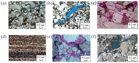 Microscopic cast thin-section photographs of rocks: (a) Well DT2, at a depth of 5112.73 m, showing tectonic fractures; (b) Well DT2, at a depth of 5124.04 m, showing tectonic fractures; (c) Well YN5, at a depth of 4846.29 m, showing tectonic fractures; (d) Well DT2, at a depth of 5105.51 m, showing bedding fractures; (e) Well YN2, at a depth of 4843.01 m, showing feldspar dissolution fractures; (f) Well DB5, at a depth of 5845.9 m, showing feldspar dissolution fractures.