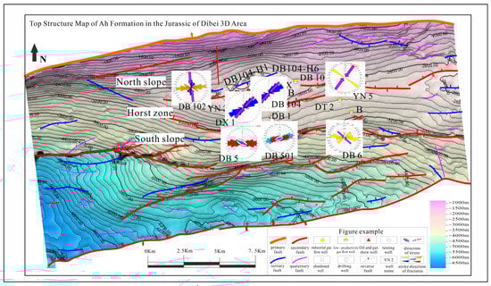 In the monocline tectonic style, due to the lack of influence of fault–fold actions, overall fracture development is scarce. Compared with the fault–fold–fracture and fault–fracture tectonic styles, the strata in the monocline tectonic style are relatively stable, lacking sufficient tectonic stress to promote the formation of large-scale fractures. Therefore, the number of fractures is small (Figure 6). Well locations, such as DB 6 and DB 102, which are in this tectonic style area, have significantly poor fracture development, conforming to the fracture distribution characteristics of the monocline tectonic style.