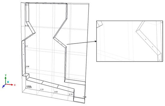 For the numerical simulations of the reactive gas phase flow in the ANSYS Fluent software, the first step consists of the definition of the computational domain to be studied. The geometric configuration of the boiler presents symmetry since the secondary air jets on the side walls are equally spaced along its width. Thus, it is only necessary to have a 1/13 slice of full width, corresponding to a slice of 320 mm in thickness. This simplification allowed for a significant reduction in the geometry modeling complexity and the subsequent mesh generation. The geometry of the boiler was developed using the scripting language from Gmsh software v.4.11, providing the possibility to automate the generation of the model with a reduced interface for the user and an easy execution of complex geometries. This configuration was based on the technical drawing of the equipment, and Figure 1 presents an overview of the geometrical model. As can be observed in this figure, the grate region in the lower part of the model was divided into three separate zones in the lengthwise x-direction according to the primary air supply. Hence, it allowed for the introduction of different boundary conditions to better reproduce the biomass thermal conversion.