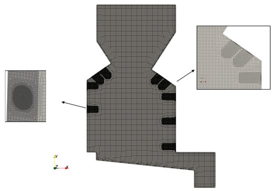 Time and effort were devoted to developing the numerical mesh as its quality affects the accuracy of the CFD results. This task required much work due to changing the domain division strategy and locations of the refinement in order to change the size of elements in the different zones of the domain. All this work was carried out in order to increase the accuracy and reliability of the results. The OpenFOAM algorithms, in particular, the cartesianMesh option, were used to generate a mesh around hexahedral cells, with refinements in specific zones to obtain a suitable resolution of the temperature and velocity field in regions of strong gradients. Three different meshes were developed to assess the influence of the discretization in the numerical results, with a minimum element size of 10 mm and a maximum of around 100 to 150 mm. The specification of these two parameters resulted in three different meshes with around 250 k, 500 k, and 1M cells. Figure 2 presents an outline of one of the developed meshes with details on specific areas where it is possible to observe the refinement that took place in the central area of the furnace and next to the secondary air injectors. As the quality of the results is highly mesh-dependent, the mesh quality parameters were controlled to obtain a high-quality mesh.