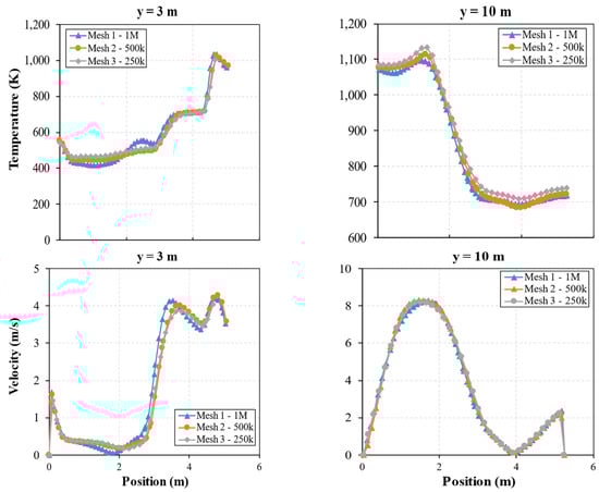 Regarding the grid independence analysis, reactive numerical simulations were performed using the different meshes and considering the nominal operating conditions. Temperature and velocity were considered as the variables of interest to assess the differences in the numerical predictions at two specific locations. The first location selected for analyzing the results was at 3 m height, slightly above the first row of secondary air nozzles, and the second location was close to the outlet (y = 10 m). As represented in Figure 3, the results presented some velocity and temperature differences, particularly when the mesh becomes denser and the number of cells is around 1M.