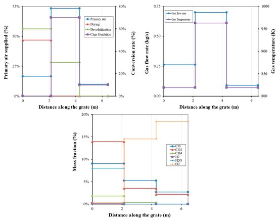This section presents the CFD results of the previously selected mesh in more detail. First, regarding biomass conversion using the bed model, for the different thermal conversion stages of this process, since the primary air supply is split in the vibrating grate, three zones were considered along the grate length. For each zone, biomass conversion rates were specified based on observations in the biomass power plant, which broadly agree with data found in the literature [,,]. These conversion rates can be found in Figure 4. Through the mass and energy balances presented in the previous section, the gas flow rate and the composition of the flue gas that are supplied to the freeboard were estimated. This information was then set as inlet boundary conditions for each zone.