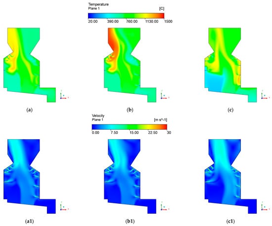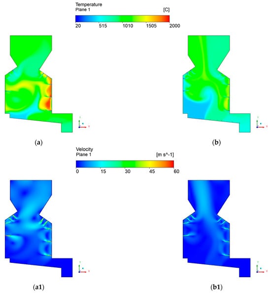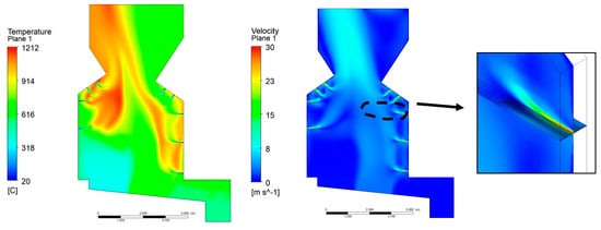 Regarding the numerical results, the method by which air is supplied to the boiler is one of the most important parameters in the combustion system. The design of the present boiler consists of two opposing arches to concentrate the flue gas and improve the mixing with the secondary air introduced in the side walls through small nozzles. In addition to the introduction of the oxidant in the main flue gas stream, its location is also important for improving the mixing and controlling the combustion process. The effect of the opposing arches and the multi-level small nozzles on the flow in the furnace can be observed in Figure 5, where the temperature and velocity contours in the middle plan of the model are presented. This design promotes concentration in the center zone of the furnace, where the velocity is higher.