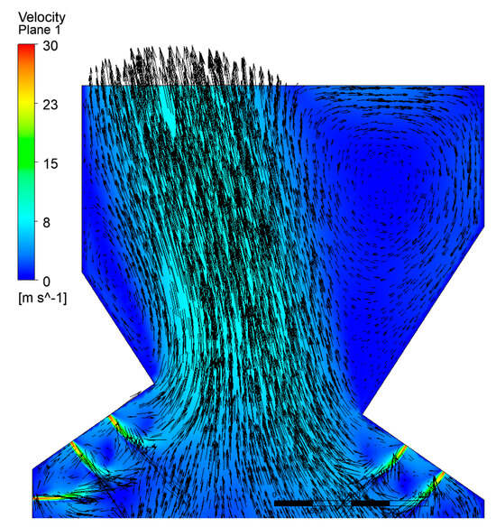 Since the design of the air supply system plays a significant role in the efficient and complete combustion of biomass, CFD simulations were developed to investigate the influence of this part of the boiler. The split ratio of primary to secondary air in a modern grate-fired boiler is 60/40 [] while, in the biomass power plant, considering the nominal operating conditions (Table 1), it is approximately 79/21. Thus, there is considerable potential for improvement since, in the previous analyses, particular attention was oriented to the need for higher penetration of the secondary air nozzles.