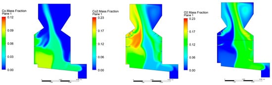 In Figure 6, the velocity field is also illustrated by superimposing velocity vectors to present the flow’s dynamic behavior in the furnace’s upper part. Apart from the secondary air nozzles providing favorable reaction conditions in terms of oxygen, they also offer high turbulence levels in the arch zone. In turn, Figure 7 presents the profiles of the CO2, CO, and O2 mass fractions. A general characteristic of oxidation reactions is the occurrence of very fast rates in the secondary air injector regions. Secondary air injectors provide favorable reaction conditions in terms of oxygen and high turbulence levels, ensuring good mixing of the oxidant with the volatiles. The fastest reaction rates are found around secondary air jets due to the greater amount of oxygen for oxidation reactions. Thus, the location and design of these injectors are essential parameters in controlling the combustion process in the furnace. The heat released by the chemical reactions provides heat transfer by radiation to the surface of the fuel in the grate, thus promoting the initiation of the drying and devolatilization processes.