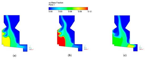 In the temperature profile illustrated in Figure 10, the highest temperature, around 2000 °C, was obtained in the first case and occurred due to the mixture of the flue gases with oxygen supplied by the lower secondary air injector present on the right-side wall of the boiler. Due to the higher amount of oxygen supplied by the secondary air injectors, the maximum peak temperature was obtained in this case when compared to the others.