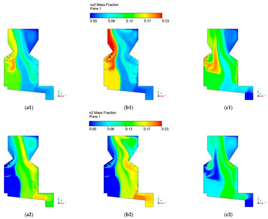 CO, CO2, and O2 mass fractions contours for (a,a1,a2) case 2, (b,b1,b2) case 3, and (c,c1,c2) case 4.