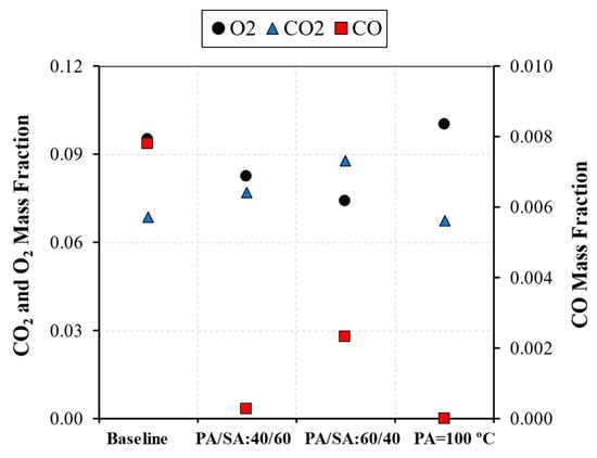 Apart from the influence of the primary-to-secondary-air ratio, another interesting variable is the primary air temperature. Preheating primary air is a common practice to improve combustion behavior and increase the power plant’s efficiency. Hence, considering the previous results, the 40/60 split ratio configuration was selected to analyze the influence of the primary air temperature. In general, the temperature of the primary could reach temperatures up to 200 °C []. However, considering the results of Silva et al. [], temperatures around 100 °C are feasible for this particular boiler. Hence, a CFD simulation was performed to analyze the effect of preheating the primary air at 100 °C.