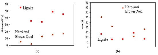 Figure 2 shows the distribution of basic characteristics of moisture, ash, and combustible components, and the lower heating value of Serbian coals used in thermal power plant combustion chambers. Large differences in the quality of lignite, hard coal and brown coal can be observed.