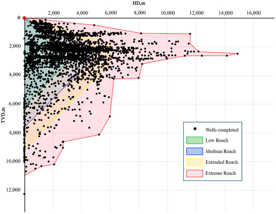 The ERD technology is currently widely used in oilfield development, particularly in offshore operations. Its primary advantage lies in the ability to cover a large area of reservoirs (especially thin layers or scattered oil reservoirs), while significantly reducing the number of drilling platforms and surface facilities required, cutting down development costs [1,2,3]. According to past experience, ERD can be classified into four types based on different horizontal–vertical ratio (HVR): low reach, medium reach, extended reach, and extreme reach, with an HVR exceeding 3.33 and horizontal displacements greater than 6096 m (20,000 ft) [4,5]. Figure 1 shows the drilling displacements worldwide [6]. It can be seen from the figure that with the demands of oilfield development and the advancement of technology, an increasing number of wells are located in the extremely extended reach area. Nowadays, the maximum well depth of extended-reach wells has exceeded 15,000 m, reaching 15,240 m (TVD of 2469 m and HD of 14,198 m) [7].