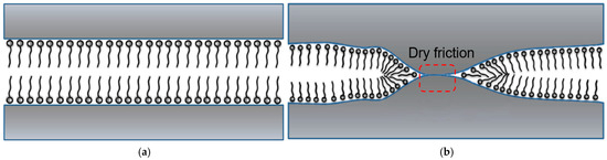 Oil-based fluids (OBDFs) are widely recognized for their superior lubricity, primarily attributed to the base oil component [14]. Compared with water-based drilling fluids, OBDFs exhibit significantly lower friction coefficients [15]. This advantage allows for the formation of a continuous and stable oil film between the drill string and the wellbore wall, which helps to minimize frictional resistance, reduce tool wear, and enhance drilling efficiency (Figure 2a). However, under extremely high-temperature and high-pressure (HTHP) conditions—typically above 150 °C and 30 MPa—the stability of the oil film deteriorates markedly [16]. The film becomes susceptible to rupture or desorption, leading to direct contact between the drill string and the wellbore or casing. This leads to a sharp increase in friction (Figure 2b), elevated consumption, and rising risks of downhole accidents such as pipe sticking, potentially interrupting operations and causing economic losses [17].