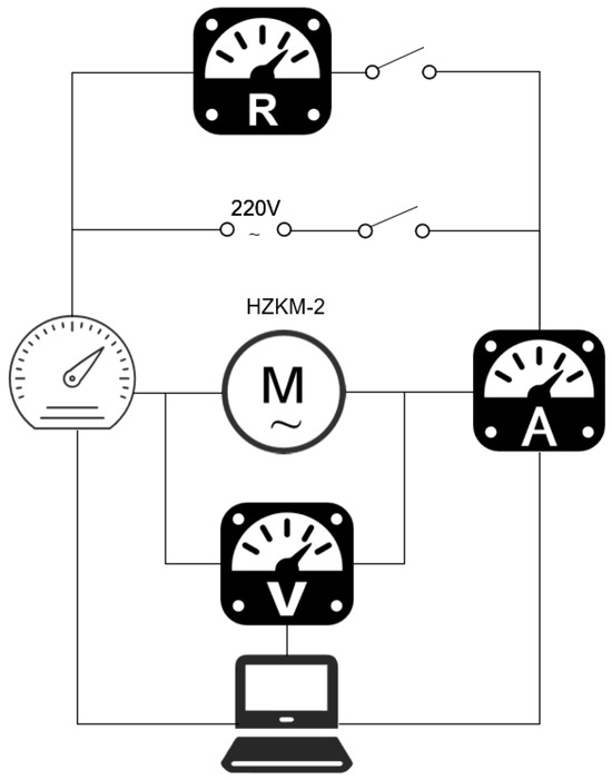 A schematic diagram of the metal–rock interface friction test apparatus is shown in Figure 3. The core testing unit is the HZKM-2 extreme pressure and anti-wear tester, which operates using an electric motor-driven rotating mechanism. On the left side of the setup, a tachometer is employed to monitor rotational speed, while a volt-ammeter measures real-time voltage and current outputs. Upon completion of the test, the circuit is switched, and a multimeter is used to measure the total resistance of the system. All time-dependent measurement data are collected and transferred to a computer for further analysis. In this test, the friction coefficient is calculated using the principle of energy conservation. The testing apparatus measures the total power changes in the rotating mechanism under applied loads. The energy loss due to friction is calculated, and the friction coefficient is derived accordingly. This method provides an accurate friction coefficient by evaluating the energy conversion during the friction process, highlighting the lubricant’s ability to reduce friction at the metal–rock interface.