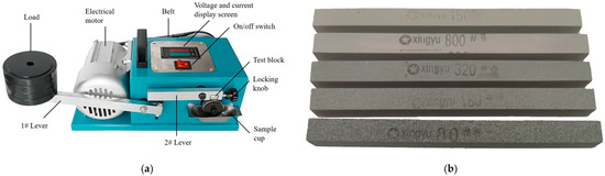 The physical configuration of the HZKM-2 tester is illustrated in Figure 4a. Notably, the sliding component in contact with the sample is interchangeable. A steel slider is used initially to simulate steel–steel friction conditions. In this study, we replaced the steel slider with custom-fabricated artificial sandstone specimens (Figure 4b), prepared by cutting quartz-based sandstone blocks with varying particle sizes into 1 cm-long cuboids, to mimic formation rocks of different permeabilities.