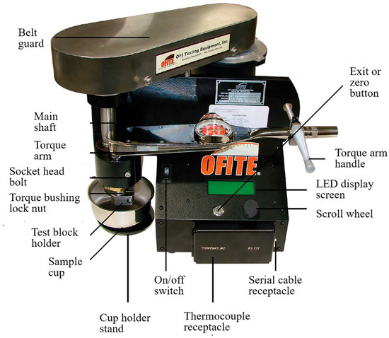 The frictional performance between metallic surfaces was evaluated using a standardized lubricity tester, as shown in Figure 6. To conduct the lubricity test, first clean the lubricity test ring and the test block with acetone, followed by thorough rinsing with deionized water, ensuring all machine parts in the sample area are spotless and avoiding bare-hand contact with metal surfaces. Install the test ring on the tapered main shaft, and preheat the machine for 15 min. Set the motor speed to 60 RPM, place the test block in the holder with the concave side outward, and zero the torque reading after 15 min of operation. This test evaluates the frictional performance between metallic surfaces by applying a constant torque. The friction force is primarily governed by the balance of applied torque and the frictional resistance between the metal surfaces. As the torque is applied, the lubricant’s effectiveness in reducing friction is measured by the torque required to maintain a constant rotational speed. This balance between the applied torque and the frictional resistance reflects the lubricant’s ability to reduce wear and friction under the high axial loads commonly encountered in drilling operations.
